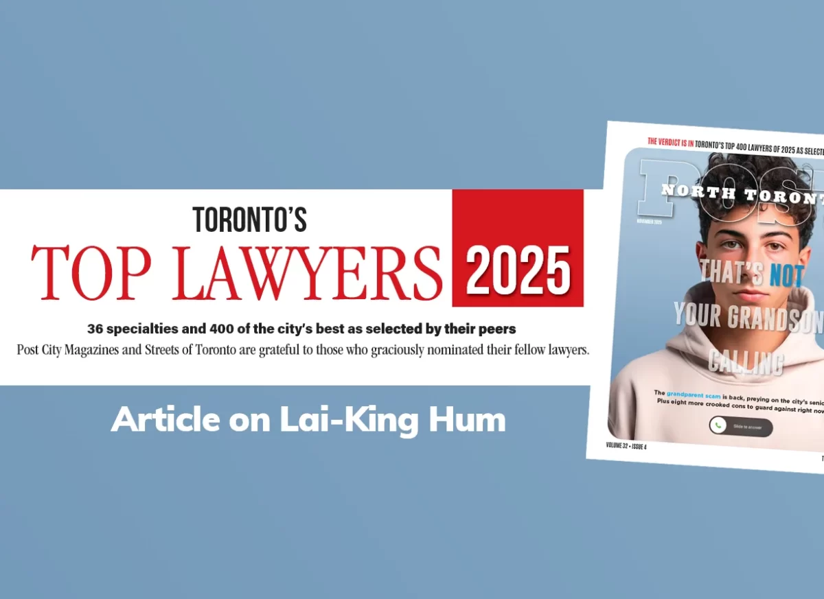 • Lai-King Hum honoured to be named one of Toronto’s Top Lawyers in 2025 by the North Toronto Post